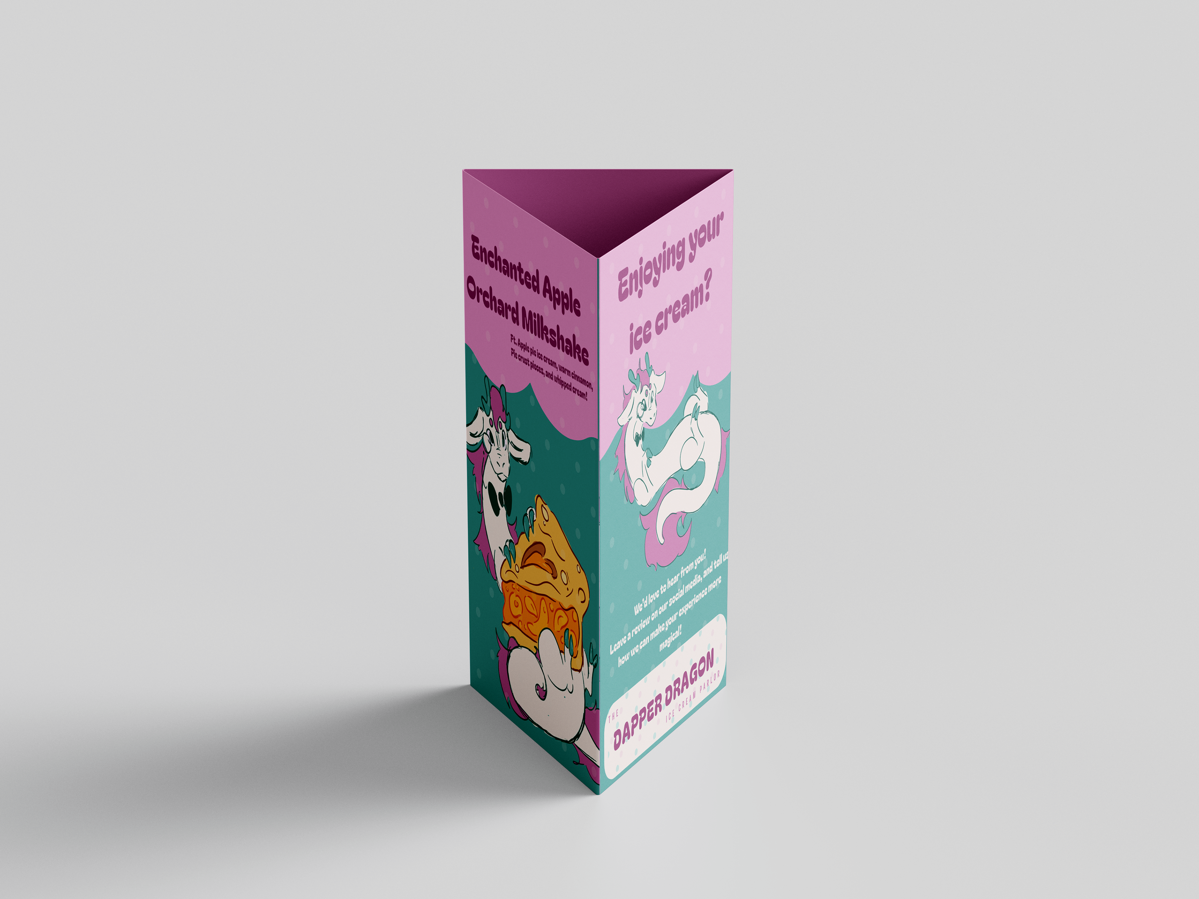 Design Brief: Dapper Dragon is a conceptual ice cream shop built around a friendly dragon mascot and a whimsical fantasy theme. The goal of the project was to create a brand experience that feels imaginative, welcoming, and instantly recognizable. The dragon character was designed to embody the personality of the shop, helping establish a cohesive visual identity that could extend across menus, storefront graphics, and merchandise. The final design presents the shop as a playful destination where storytelling and dessert culture combine to create a memorable customer experience.